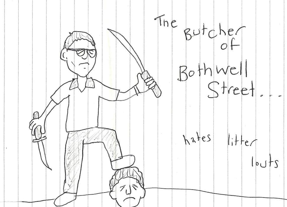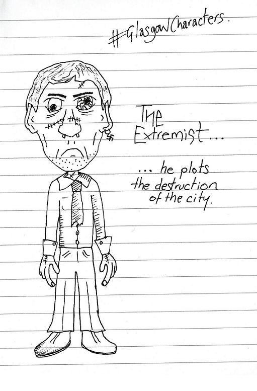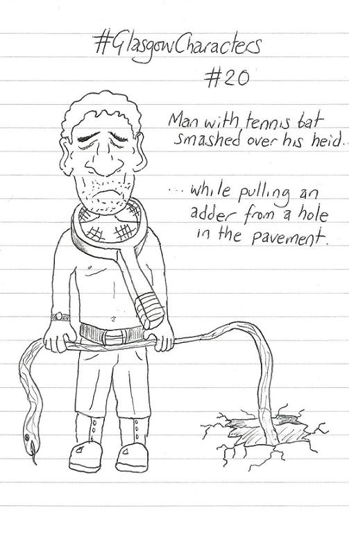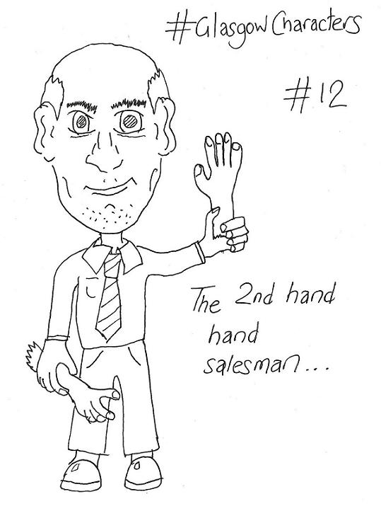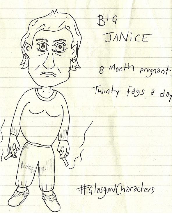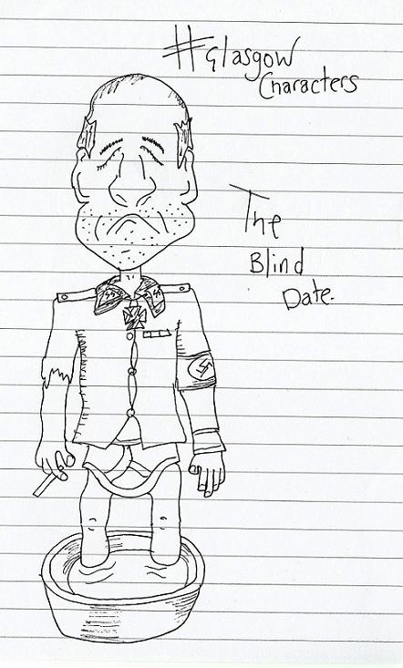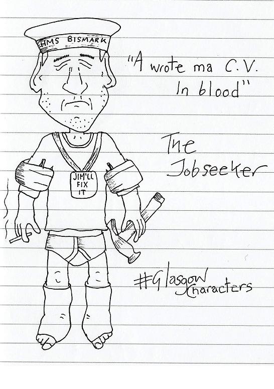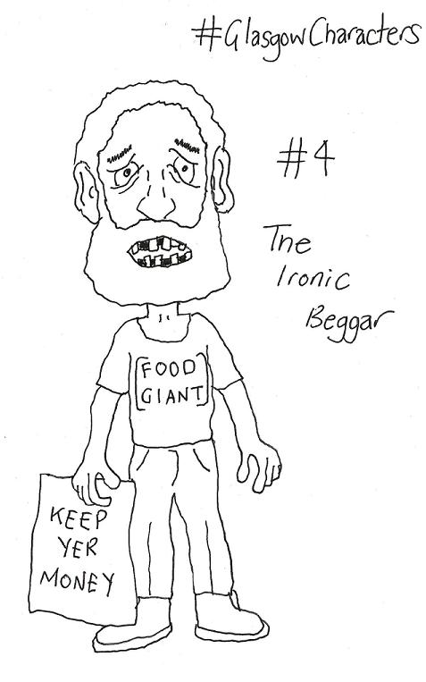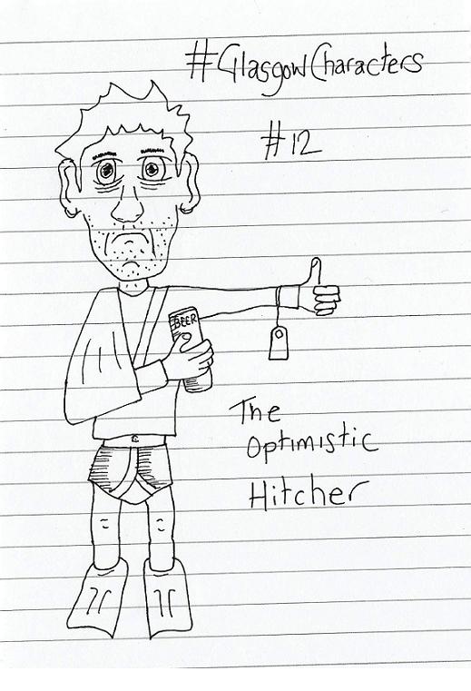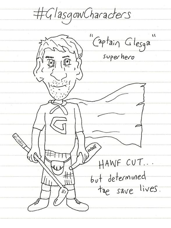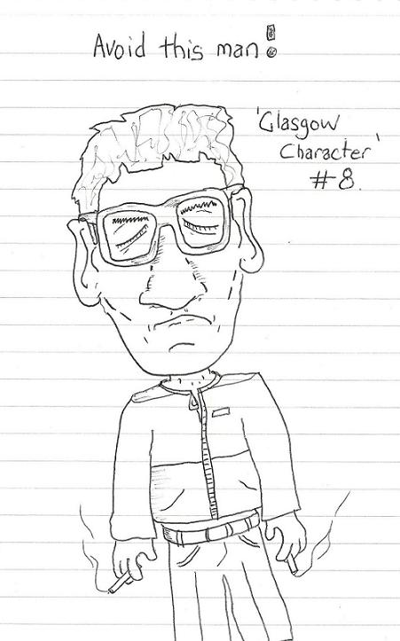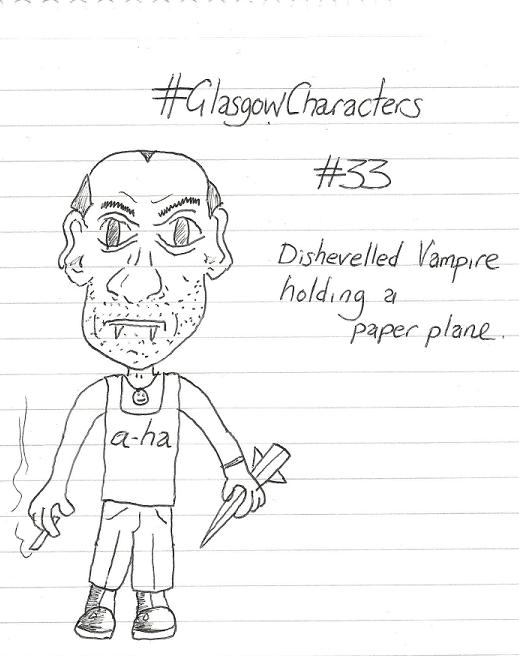 This is my #GlasgowCharacters page, where various personages from the imaginings of my mind are displayed in ink format, sometimes known as drawings. Anyone who thinks these drawings refer to themselves or believe themselves visually libelled, need not take legal advice…they do not refer to you; however if you would like to be immortalised as a Glasgow Character, I will be delighted to illustrate you on notepad paper. I work exclusively with a black pen and a notepad and each drawing takes me seconds, sometimes several minutes, to complete. Due to the volume of Glasgow Characters I initially numbered them, but have stopped this practice…also, if you search #GlasgowCharacters on Twitter you may be able to find some which are not on this site. I now present, The Ironic Beggar…The Dishevelled Vampire, The Glum Man Holding a Map, The Disaster Nostalgist, and many more…
